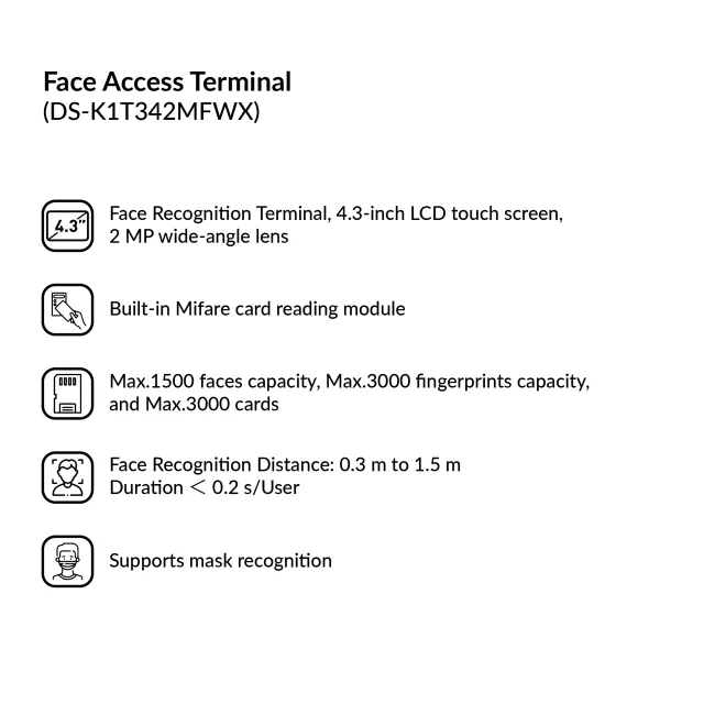 - Face Recognition Terminal, 4.3-inch LCD touch screen,2 Mega pixel wide-angle lens,Built-in Mifare card reading module